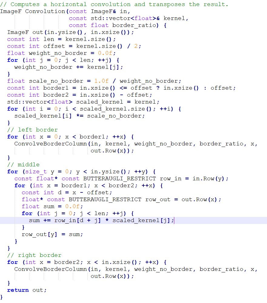What you are seeing is a report that shows which functions of the program were taking up most of the processing time when converting a 720p image. As you can also see, I ran this test on the x86_64 machine Xerxes. I did attempt to use perf on the AArch64 machine Isreal, but perf did not seem to be installed. There were some server issues earlier in the week, so the OS might have been reinstalled. In any case, that’s something I will ask my professor about later in the week. For now though, this data will be enough for our purposes. Looking at the list it is clear that the function “Convolution” takes the most time. This makes sens seeing as convolution is actually a artificial intelligence, and image process algorithm. In the case of artificial intelligence this helps in image recognition, however in our case if I had to guess, this helps to determine where the level of detail in the image can be lowered with minimal to no appreciable difference in quality. It’s probably best you click the link I provided on convolution for more information, as it is very through. Not to mention it may even have solutions for speeding up the algorithm… It’s worth taking a look if nothing else.