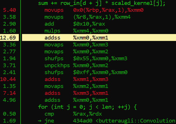 Now in the perf report we see that there is an assembler opcode operation that takes up 12.69% of the processing withing this single function. The opcode in question is “addss,” which works in a similar to the assignment operator += in conventional programming, but is specifically reserved for floating point values. Now if you look at the C++ code, you will notice that the variable “sum” is of type float, and has been initialized with a single precision floating point value, denoted with f. This is why assembler is using the addss opcode. Frankly, almost all of those assembler opcodes listed in the picture are reserved for handling floating point values. Crazy huh? Well as we have learned, decimals are very very trik… Impossible to represent literally in binary, so it is understandable that working with values like this would require quite a bit of extra processing from the cpu.