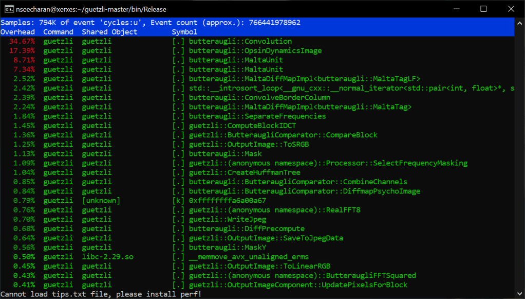 Hello everyone, I’m back to report progress on the second phase of trying to diagnose, and propose optimizations for the image compression software Guetzli. If you recall in the first step, we were conducting benchmark test to see exactly what sort of performance we could get out of the program using some of the stock compiler optimization options. What we discovered was that this program is really really slow! So why is this, and also what part of the program is contributing the most to the slowdown? Well in this stage we shall find out!